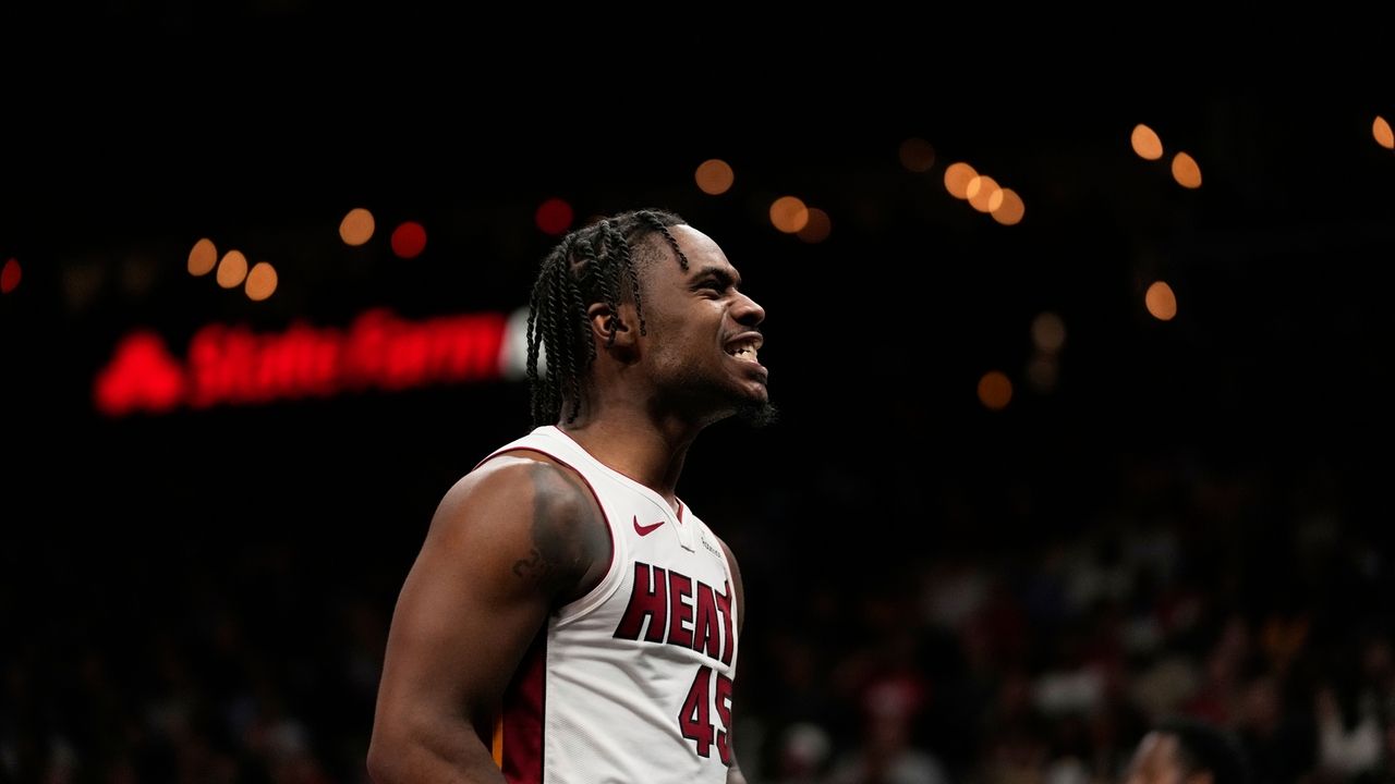 Miami Heat guard Davion Mitchell (45) leaves the court after a win against the Atlanta Hawks, after an NBA play-in tournament basketball, Friday, April 18, 2025, in Atlanta. Credit: AP/Brynn Anderson