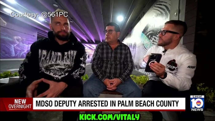 The video shows Lampros and Vitaly Zdorovetskiy, a YouTuber and prankster who streams on Kick, ambush Diaz, 50, outside the IPIC movie theater in Delray Beach.